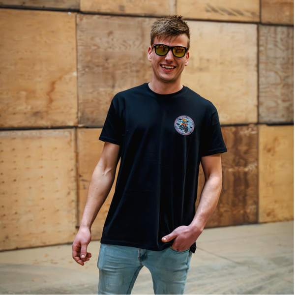 Zwart T-shirt met een mooie uitgesproken opdruk op zowel de voorkant als de achterkant.