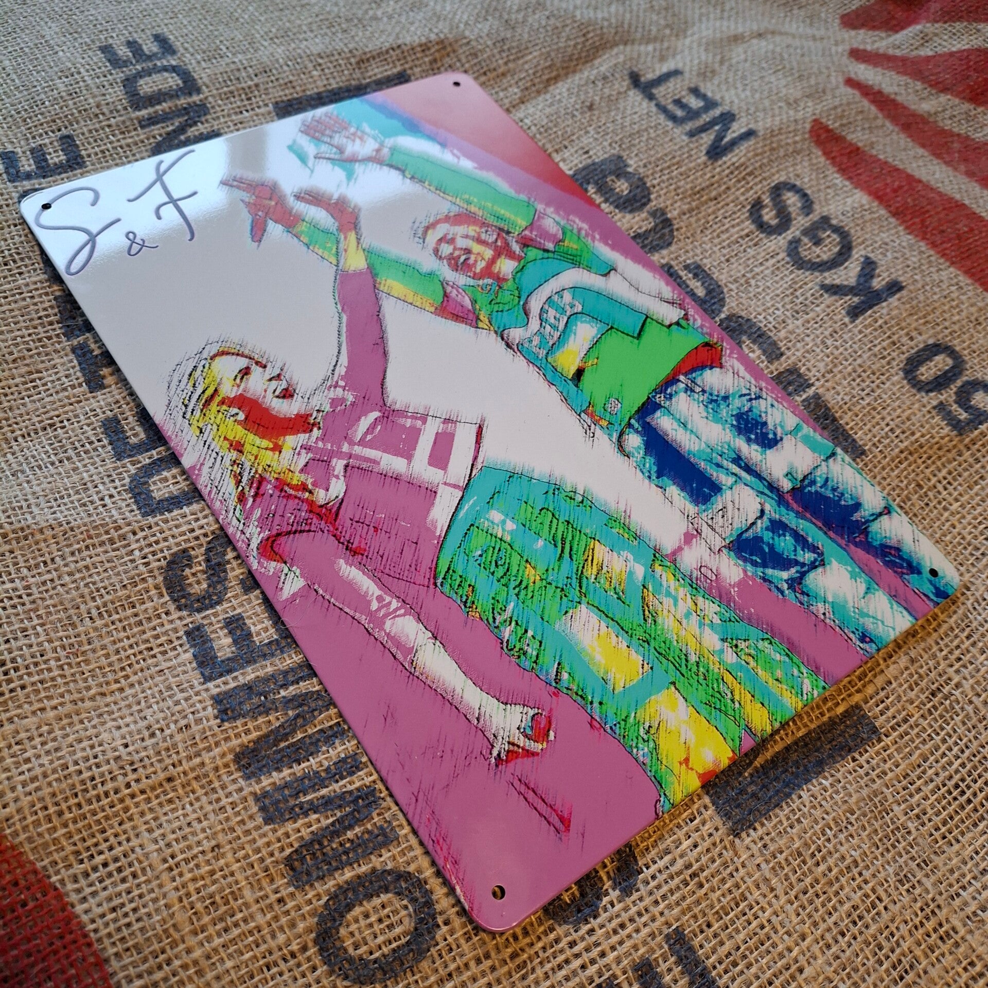 Metalen wandplaat van Suzan & Freek die in 2024 live hebben opgetreden op Grandioos! Degene die erbij waren weten wat we bedoelen. De afmeting is ongeveer 20 centimeter x 30 centimeter. Voorzien van 4 gaatjes om hem op te hangen.