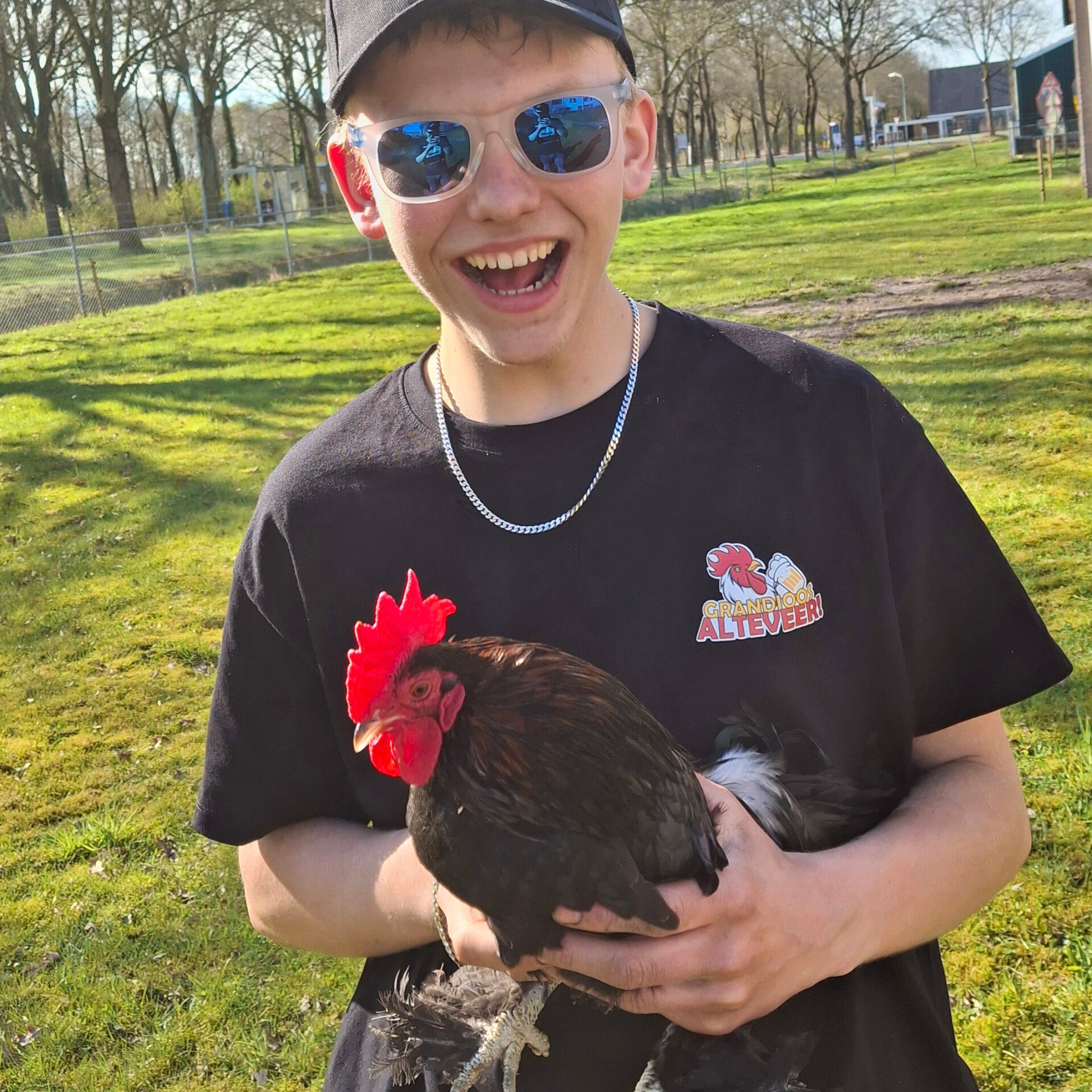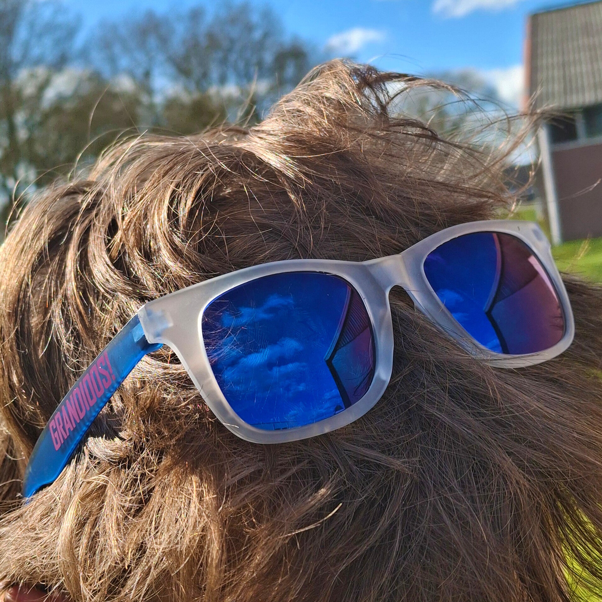 Blauwe zonnebril met grijze accenten en het Grandioos logo gedrukt in het roze. Voor de ultieme bescherming tegen de zon! Let op: beschermt niet tegen stoeptegels en andere vliegende objecten. Wel tegen het pikken van een haan.