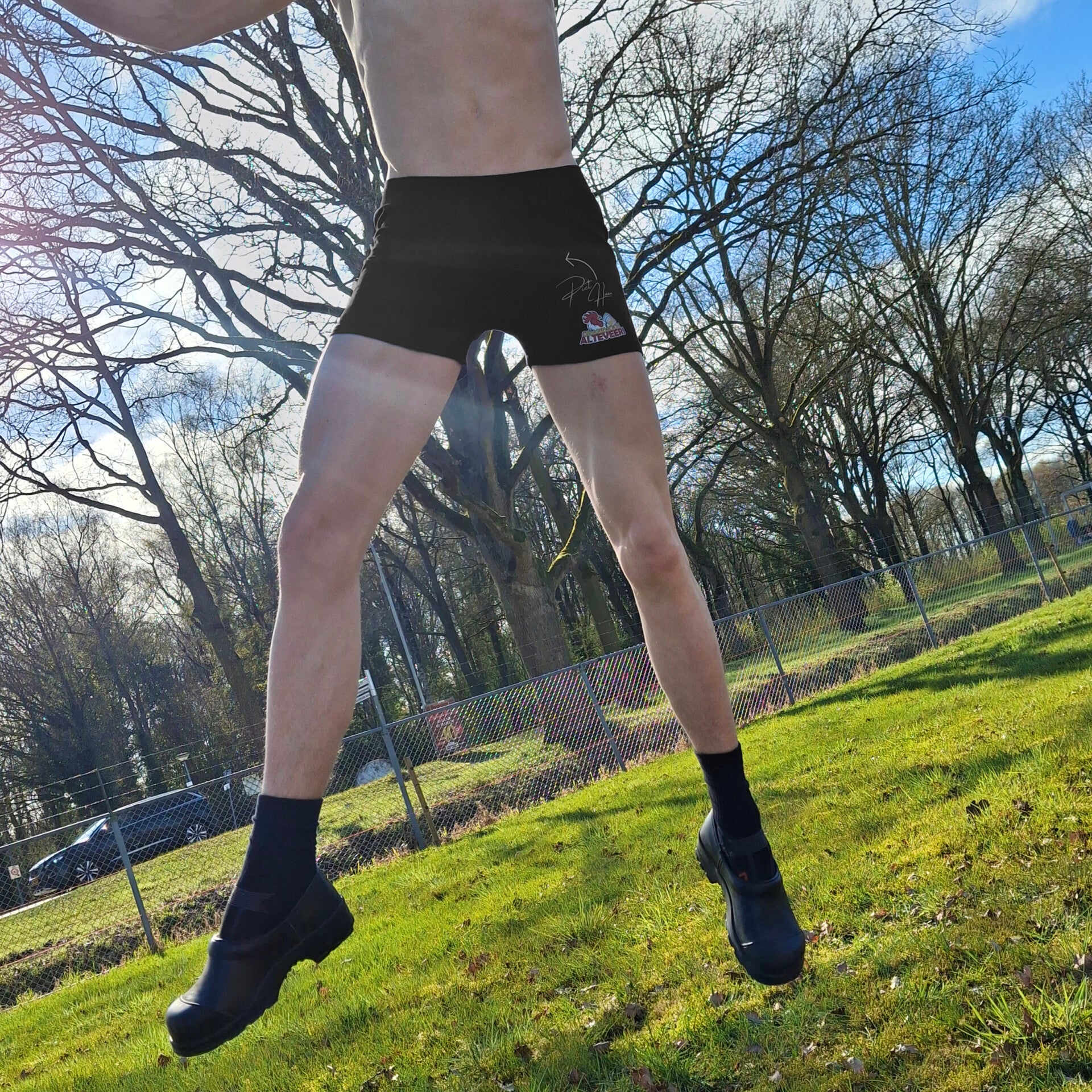 Zwarte onderbroek met het Grandioos Logo en een pijl naar de zogenaamde 'Piet Haan'. Hierdoor is deze makkelijker te vinden waardoor het vrijen vlotter verloopt. Een win-win situatie!